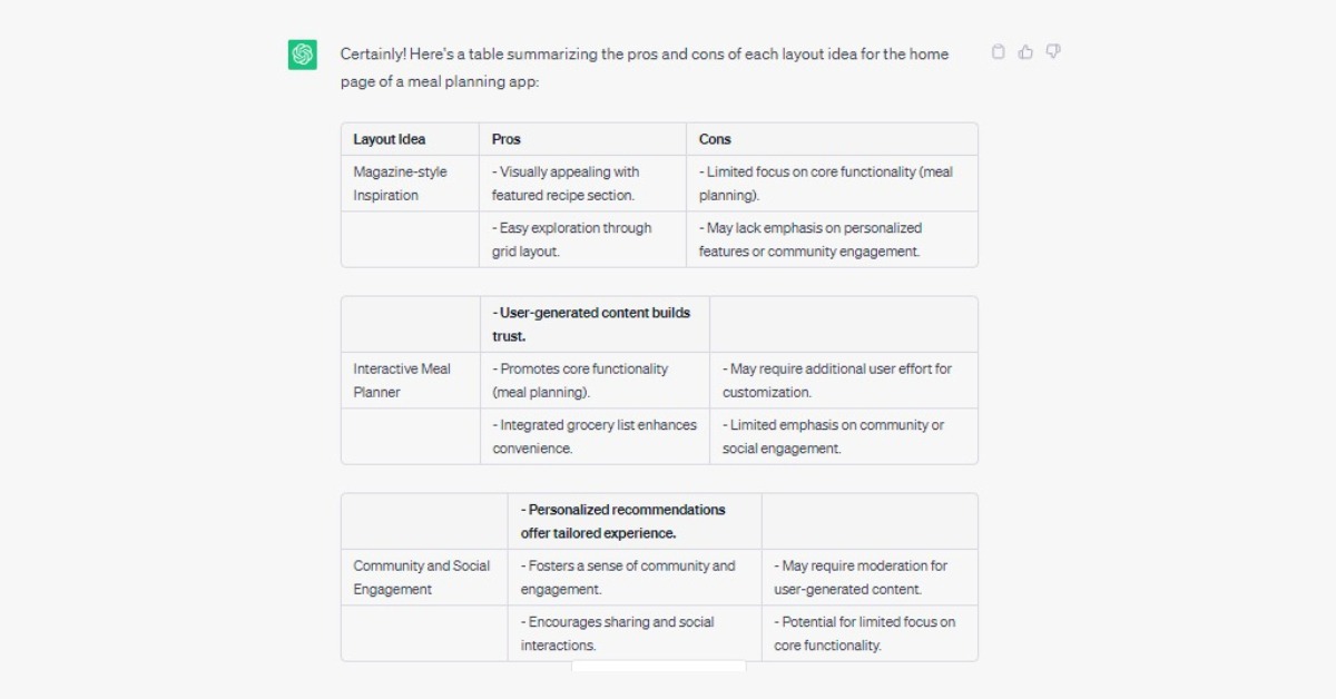 Prompt: can you list the pros and cons of each layout idea in a table format