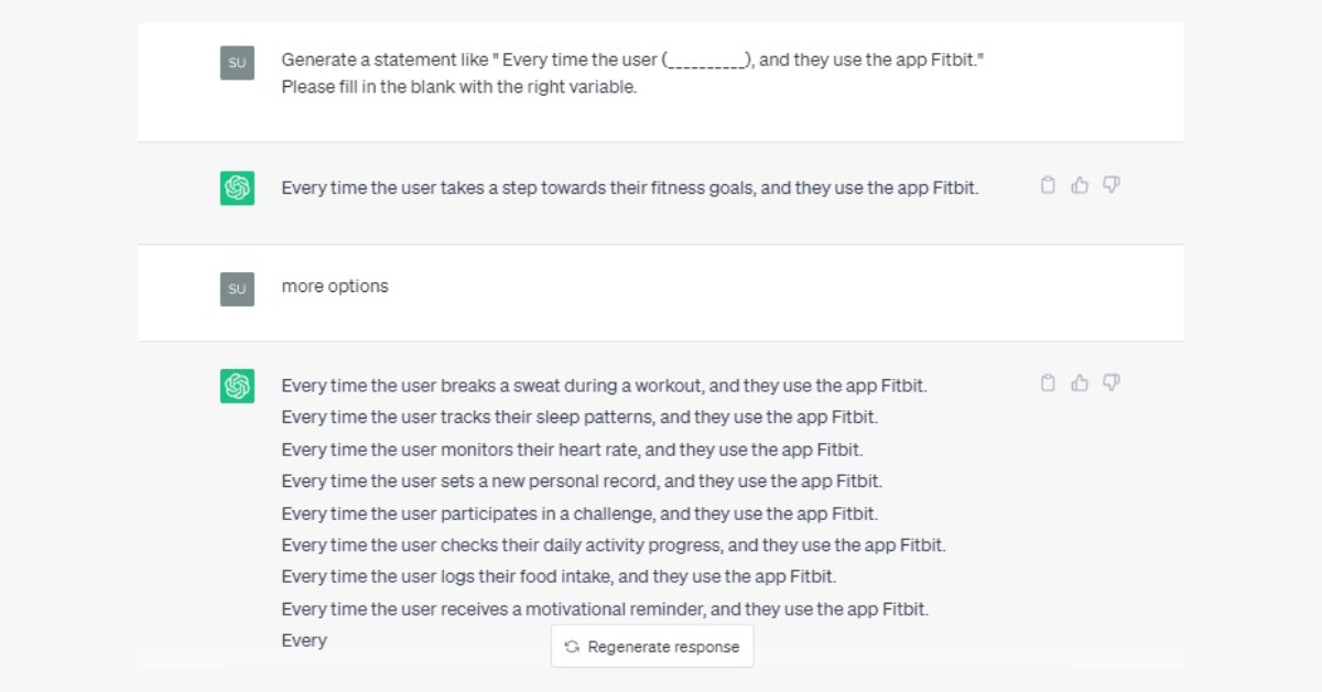 Prompt: Generate a statement like ” Every time the user (__________), and they use the app Fitbit.” Please fill in the blank with the right variable.