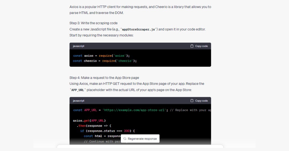 Prompt: I want to scrape App Store reviews of our app using Javascript. Walk me through it step by step.